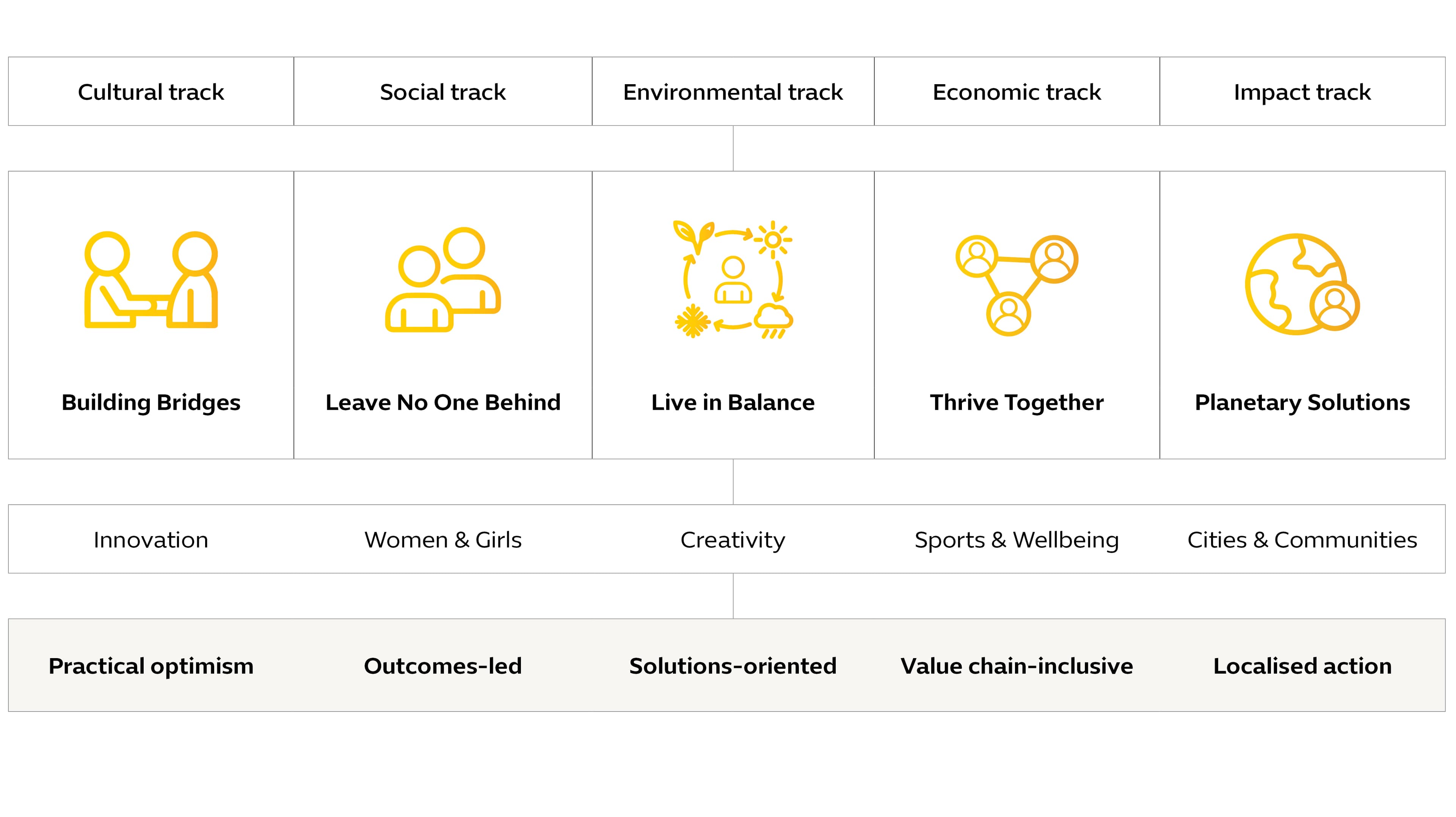 Four of these offer a clear lens through which to contextualise the world’s priorities – cultural, social, environmental, and economic – with a fifth track focused on impact, cooperation and exponential tangible outcomes for shared global good.
