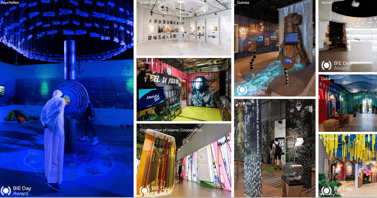 Among our Expo 2020 award-winning pavilions were (clockwise from left): Seychelles, South Sudan, Guinea, Yemen, Cuba, Comoros, Uganda, Organisation of Islamic Cooperation and Jamaica